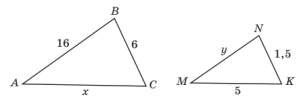 6. Відомо, що \triangle ABC \sim \triangle MNK. Знайдіть x і y