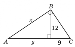 9. Використовуючи властивості прямокутного трикутника з висотою h=12 см та проєкцією одного з катетів на гіпотенузу 9 см, оберіть правильну пару (x; y), де x — довжина катета, що відповідає даній проєкції, а y — довжина іншої проєкції.