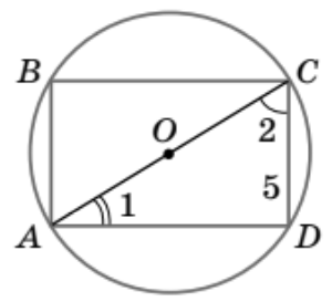 2. ABCD — прямокутник. \angle 2 - \angle 1 = 30^\circ, CD = 5. Знайдіть радіус R описаного кола.
