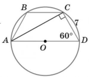 5. ABCD — рівнобічна трапеція, навколо якої описано коло. CD = 7, \angle D = 60^\circ. Знайдіть радіус R цього кола.