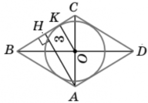 8. ABCD — ромб. \angle ABC : \angle BCD = 1 : 5, радіус вписаного кола r = 3. Знайдіть довжину сторони AB.