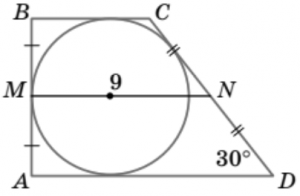 11. ABCD — прямокутна трапеція, в яку вписано коло. Середня лінія MN = 9, \angle D = 30^\circ. Знайдіть довжину більшої бічної сторони CD.