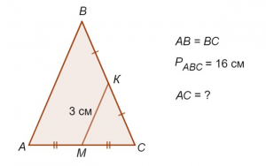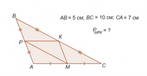 15 Експрес-контроль Середня лінія трикутника 1 / 9 Середня лінія трикутника сполучає середини двох його кутів Так Ні 2 / 9 Всього в трикутнику можна провести три середні лінії Так Ні 3 / 9 Середня лінія трикутника завжди паралельна стороні трикутника, із якою в неї немає спільних точок Так Ні 4 / 9 Довжина середньої лінії трикутника дорівнює квадратному кореню із площі трикутника Так Ні 5 / 9 Довжина середньої лінії трикутника дорівнює половині суми сторін трикутника, які вона сполучає Так Ні 6 / 9 Знайдіть одну із середніх ліній рівностороннього трикутника, периметр якого дорівнює 18 см Перевірити 7 / 9 Знайди периметр трикутника MPK Перевірити 8 / 9 Знайди периметр трикутника ABC Перевірити 9 / 9 Знайди довжину сторони AC Перевірити Your score is