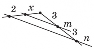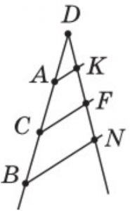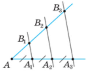 2 Експрес-контроль Теорема Фалеса 8 клас 1 / 10 За допомогою теореми Фалеса можна поділити відрізок на будь-яку кількість рівних частин Так Ні 2 / 10 Теорема Фалеса справджується не лише для сторін кута, а й для будь-якої пари прямих Так Ні 3 / 10 Згідно з теоремою Фалеса, паралельні прямі діляться кутом на рівні відрізки Так Ні 4 / 10 Теорема Фалеса справджується для будь-якої кількості паралельних прямих Так Ні 5 / 10 За допомогою теореми Фалеса можна знайти градусну міру кута Так Ні 6 / 10 На малюнку АА1 = А1А2 = А2А3 і А1В1 || A2B2 || A3B3. Знайдіть В2В3, якщо АВ3 = 12 см. Перевірити 7 / 10 На малюнку АА1 = А1А2 = А2А3 і А1В1 || A2B2 || A3B3. Знайдіть АВ1, якщо В2В3 = 6 см. Перевірити 8 / 10 DВ = 18 см, DK = KF = FN, АK || СF || ВN. Знайдіть АВ. Перевірити 9 / 10 т || п. Знайдіть х. Перевірити 10 / 10 MN || KL. Порівняйте відрізки MР і KM. MР > KM. MР = KM. MР < KM. Порівняти не можна Your score is