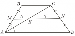 6. ABCD — рівнобічна трапеція. MK = 5, KN = 7. Знайдіть периметр трапеції.