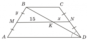 8. ABCD — рівнобічна трапеція з периметром 60. MK = 15. Знайдіть y.